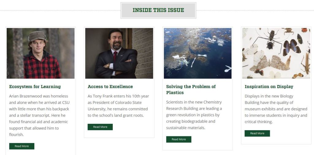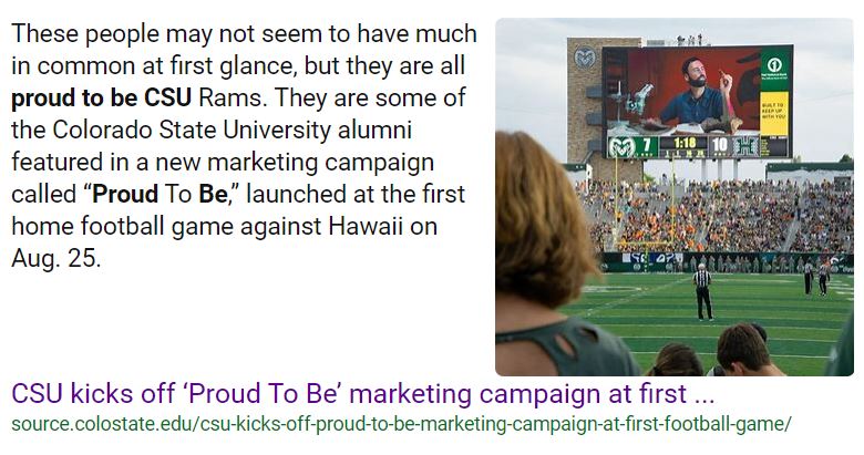 A comprehensive brand campaign that was exactly that: comprehensive! Focusing on student recruitment, alumni engagement, community outreach and creating a new and memorable way for all of Colorado State University’s constituents to connect with, support and engage. An innovative theme that captured a student chant, and turned it into an institutional rallying cry! Striking images paired with compelling, authentic stories, and smart implementation strategies that used the entire institutional communications channels, at multiple levels, to drive our messaging home. This effort, along with the tireless work of so many at the institution, helped produce not just record-enrollment totals and the early completion of a $1 billion fundraising campaign, but created a sense around the nation and state and the university’s many stakeholders that they are indeed “Proud to be CSU Rams.” Please go to proudtobe.colostate.edu to see more, and to check out the crazy good 30-second spot. And here are a few of the more notable images of this great multi-year campaign and marketing effort: