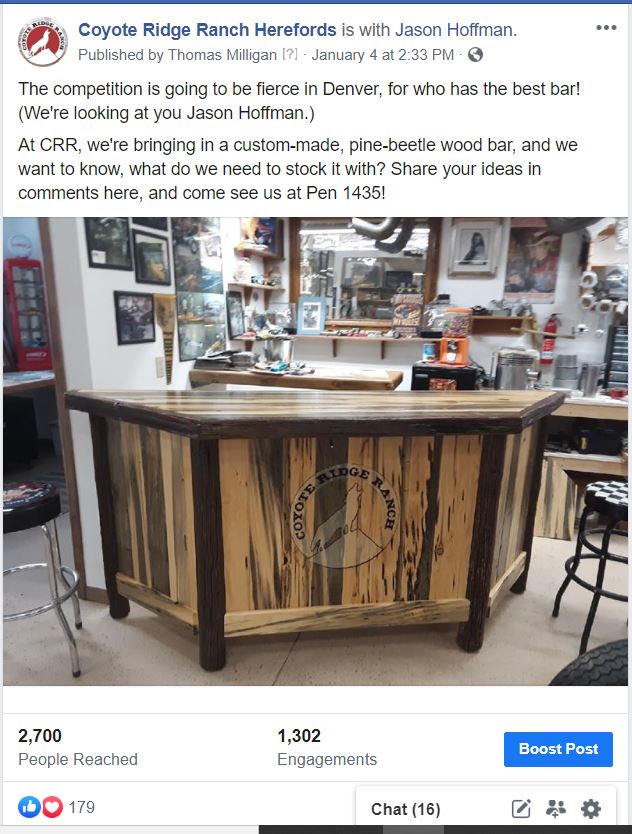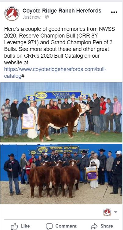Add to that great earned media placement just at the right time in the region’s leading newspaper The Denver Post, and a focus on The National Western Stock Show through comprehensive engagement that led to sales, not just sales-only communications. All in all, we drove a plan to meet and even exceed ambitious goals. Check out CRR at coyoteridgeherefords.com or look at their main social media element, CRR Facebook Here’s a look at just some of the elements of this successful marketing operation: